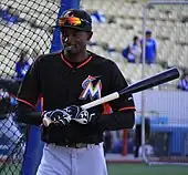 On September 26, the day after teammate and friend José Fernández died in a boating accident, Gordon led off the game versus the Mets. A left handed hitter, he took the first pitch of his at bat as a right-handed batter, imitating Fernández's batting stance, with Fernández's batting helmet in honor of his late friend; pitcher Bartolo Colon, out of respect, threw the pitch for a ball. Gordon then switched to bat left handed as he does naturally and, following a second ball, Colon threw a fastball down the middle of the strikezone, which Gordon hit for his first home run of the year.[38] He rounded the bases fighting off tears and hugged teammates upon his arrival back to the dugout. He said after the game that he had never hit a ball that far even in batting practice, adding, "If y'all don't believe in God, y'all might as well start. For that to happen today, we had some help."[39] Gordon's tribute home run to Fernández has been described as a "transcendent MLB moment."[40]