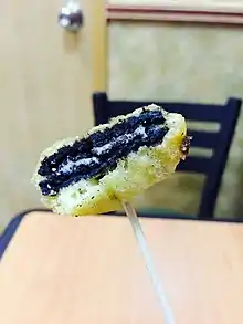 A deep-fried Oreo is a dessert or snack consisting of a chocolate sandwich cookie which is dipped in batter and deep fried. It may be served with different toppings, most commonly powdered sugar. Deep-fried Oreos are generally made using Oreo-brand cookies, hence the name, but other chocolate sandwich cookies can be used.