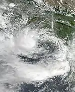 Early on September 3, the IMD reported that an area of low pressure had formed embedded within the monsoon off the Orissa coastline.[21] During the next day it developed further with the IMD reporting that the low-pressure area had become well marked with deep convection starting to consolidate around a developing low level circulation center in an area of moderate vertical wind shear.[22][23] Early on September 5, as the area of low pressure was moving into an area of low vertical windshear the JTWC issued a Tropical Cyclone Formation Alert, whilst the IMD reported that the low-pressure area had intensified into a Depression.[24][25] Later that day the IMD reported that the depression had intensified further and had become a Deep Depression, whilst the JTWC designated the depression as a Cyclone 03B, with winds equivalent to a tropical storm.[26][27] However the JTWC's first warning was also their final warning as the cyclone had made landfall near Digha in West Bengal and was expected to dissipate later that day.[27][28] However the IMD kept issuing advisories on the deep depression until early on September 7, when the IMD reported that it had weakened into a depression and then into a well marked low-pressure area later that day when they stopped issuing advisories on the depression whilst it was located over Jharkhand and adjoining region of Chhattisgarh.