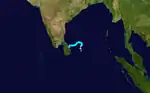 On December 10, RSMC New Delhi announced that Depression BOB 05 had formed, about 400 km east-southeast of Batticaloa, Sri Lanka.[31] The next day it strengthened to become Cyclonic Storm Ward.[32] After wandering some time to the east of Sri Lanka, the system made landfall near Trincomalee on December 14 as a Deep Depression.[33] Cyclonic Storm Ward dissipated completely on December 16. Sirkali in Tamil Nadu recorded 140 mm of rainfall on 15 December. Maximum winds of 25 knots (46 km/hr) was reported at the Pamban observatory in coastal Tamil Nadu.[14]