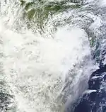 In late October, a low-pressure area formed over the Arabian Sea. It slowly consolidated and a Tropical Cyclone Formation Alert (TCFA) was issued by the Joint Typhoon Warning Center (JTWC) on October 24.[27] The following day, the India Meteorological Department (IMD) classified the storm as a depression, designating it ARB 02, and the JTWC estimated tropical storm winds at the storm's center, starting advisories for the system.[28] On October 26, the system remained stationary and intensified into a Deep Depression. Subsequently, the IMD reported the storm had intensified into a cyclonic storm, and named it Nilofar.[29][30] The following day, the IMD upgraded the storm into a severe cyclonic storm and further to a very severe cyclonic storm, and the JTWC reported hurricane-strength winds at Nilofar's center as it meanwhile developed an eye feature.[31][32][33] On October 28, Nilofar underwent rapid intensification throughout the day, reaching a peak strength of 950 mbar (28.05 inHg) with wind speeds exceeding 205 km/h (127 mph), tied with Hudhud. Over the following days, the storm recurved northeastwards and experienced high vertical wind shear, causing it to weaken rapidly into a minimal cyclonic storm on October 30. The low-level circulation center of the storm became exposed in the following hours and IMD downgraded the storm into a well-marked low-pressure area on October 31, issuing its final advisory for the system.