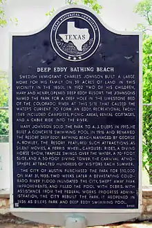 Deep Eddy began as a swimming hole located along the banks of the Colorado River which flows through Austin. It takes its name from an eddy that was formed by a large limestone outcropping which once jutted out into the river. In 1902, siblings Mary and Henry Johnson established the Deep Eddy Bathing Beach on the property (which was owned by their father).[2] At that time the property was located outside of Austin, but was a short walk from the end of the city's electric trolley car line.[3] Along with boating, camping, and fishing, amenities included a zip line, a dancing pavilion,[4] and a horse-powered merry-go-round.[2] In this era, before the advent of widespread public parks, the Deep Eddy Bathing Beach served as a "privately owned recreation area open to the public."[2]