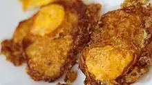 A deep fried egg is an egg dish consisting of an egg that has been deep fried. Sometimes the dish is prepared only using the egg yolk, which is referred to as the deep fried egg yolk.[1] Various types of eggs can be used to prepare the deep fried egg, such as chicken, duck and quail eggs. The dish is sometimes served alone, and is also used as an ingredient for various dishes. The dish is sometimes prepared using pre-cooked eggs that are breaded and deep fried.