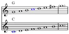 A common tone is a pitch class that is a member of, or common to, a musical scale and a transposition of that scale, as in modulation.[1] Six of seven possible common tones are shared by closely related keys, though keys may also be thought of as more or less closely related according to their number of common tones. "Obviously, tonal distance is in some sense a function of the extent of intersection between diatonic PC collections of tonal systems".[2]