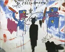 The Death of Michael Stewart, known as Defacement, is a painting created by American artist Jean-Michel Basquiat in 1983. The artwork is Basquiat's response to anti-Black racism and police brutality. It memorializes the death of Michael Stewart at the hands of New York City Transit Police for allegedly writing graffiti in the subway. No graffiti was found, according to Stewart’s girlfriend at the time of his death, Suzanne.