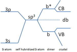 A simpler and more qualitative way of determining dangling bond energy levels is with Harrison diagrams.[1][2] Metals have non-directional bonding and a small Debye length which, due to their charged nature, makes dangling bonds inconsequential if they can even be considered to exist. Semiconductors are dielectrics so electrons can feel and become trapped at defect energy states. The energy levels of these states are determined by the atoms that make up the solid. Figure 1 shows the Harisson diagram for the elemental semiconductor Si. From left to right, s-orbital and p-orbital hybridization promotes sp3 bonding which, when multiple sp3 Si-Si dimers are combined to form a solid, defines the conduction and valence bands. If a vacancy were to exist, such as those on each atom at the solid/vacuum interface, it would result in at least one broken sp3 bond which has an energy equal to that of single self hybridized Si atoms as shown in Figure 1. This energy corresponds to roughly the middle of the bandgap of Si, ~0.55eV above the valence band. Certainly this is the most ideal case whereas the situation would be different if bond passivation (see below) and surface reconstruction, for example, were to occur. Experimentally, the energies of these states can be determined using absorption spectroscopy or X-ray photoelectron spectroscopy, for example, if instrument sensitivity and/or defect density are high enough.
