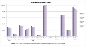 In 2015, illegal deforestation in the Amazon was on the rise again for the first time in decades; this was largely a result of consumer demand for products like palm oil.[122] As consumer pressure increases, Brazilian farmers clear their land to make more space for crops like palm oil, and soy.[123] Also, studies done by Greenpeace showed that 300 billion tons of carbon, 40 times the annual greenhouse gas emissions from fossil fuels, are stored in trees.[124] In addition to the carbon release associated with deforestation, NASA has estimated that if deforestation levels proceed, the remaining world's forests will disappear in about 100 years.[124] The Brazilian government adopted a program called RED (United Nations Reducing emissions from deforestation and forest degradation Program) in order to help prevent deforestation.[125] The RED program has helped more than 44 countries across Africa with the development of education programs and has donated more than $117 million to the program.[125]