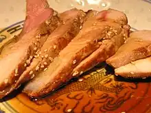 The meat is removed and the majority of the fat is poured off, leaving a small amount with the dried and browned meat juices. The pan is returned to the heat, and a liquid such as vegetable or meat stock, a spirit, wine, or verjuice is added to act as a solvent. Dairy, however, is not recommended for deglazing, as it may curdle when added to high heat.[2] The solvent allows the cook to scrape the dark spots from the bottom of the pan and dissolve them, incorporating the remaining browned material at the bottom of the pan into a basic sauce.[2] The culinary term fond, French for "base" or "foundation", refers to this sauce.[3] (In the United States, fond may also be used interchangeably with sucs.[4])