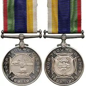 The Dekoratie voor Trouwe Dienst (Decoration for Devoted Service), post-nominal letters DTD, was instituted in terms of Government Notice no. 2307 dated 21 December 1920 and published in the Union of South Africa Government Gazette of 24 December 1920. It was a retrospective award for distinguished and especially meritorious service by Boer veteran officers during the Second Boer War between 11 October 1899 and 31 May 1902.[1][2][5][6][7]