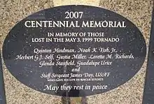 A memorial stands along a walking and bike path on Sooner Road and is dedicated to the seven people who lost their lives during the May 3 tornado.[31] United States Air Force Staff Sergeant James Day was killed in an ATV accident on May 8, 1999, while he was patrolling an area of Tinker AFB, Oklahoma, which had been damaged in the tornado. He is also listed on the memorial.[32]