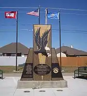 The War Memorial located opposite the Del City Community Center has several monuments dedicated to those who were killed in combat who were either born or lived in Del City. The memorial is dedicated to twenty one servicemen killed while serving in various branches of the U.S. Military during World War II, the Vietnam War and the Iraq War. Dedicated in November 2010, the memorials include an armored personnel carrier and a Fallen Soldier Battle Cross being watched over by two crouched U.S. servicemen. The memorial also has a time capsule.[11]