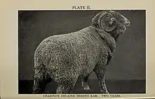 The Delaine Merino is a type of Merino sheep predominant in North America. It has fewer skin wrinkles than some types of Merino, but still has a fine, oily fleece that extends through the legs. They are hardy and long–lived, with an ability to thrive on the arid ranges of the Southwest United States.[1] This breed originated in Spain, and is raised primarily for wool production.[2]