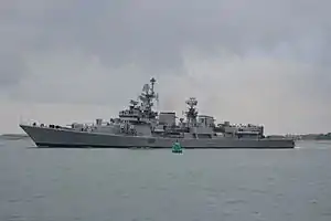 The electronic warfare suite originally consisted of BEL Ajanta Mk 2 for electronic support measures, Elettronica TQN-2 jammer and two PK-2 chaff launchers of Russian origin.[2] The Ajanta Mk 2 system was later replaced by Ellora, which has an additional capability to provide electronic countermeasures.[10] BEL Shikari combat display and management system, a derivative of Italian IPN-10, integrates weapon systems of diverse origin.[8] Each vessel can carry two Westland Sea King Mk 42B helicopters. The helicopters carry a surface search radar, a dipping sonar, A244-S lightweight torpedoes and Sea Eagle anti-ship missiles.[11] Samahé helicopter handling system is fitted on all vessels.[2]