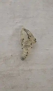 The 2.5cm pupa has a short black ridge anteriorly and spike-like dorsal processes across most body segments and spike-like lateral black processes in the early abdominal segments. A few black streaks are located in the wing pad.