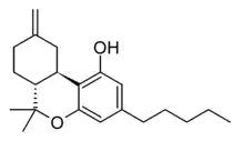 Delta-11-Tetrahydrocannabinol (Delta-11-THC, Δ11-THC, Δ9(11)-THC, exo-Tetrahydrocannabinol) is a synthetic isomer of tetrahydrocannabinol, developed in the 1970s. It can be synthesised from Δ8-THC by several different routes,[1][2][3] though only the (6aR, 10aR) enantiomer is known. In animal studies it was found to be active in mice with around 1/4 the potency of Δ9-THC,[4] but did not substitute for THC in rhesus monkeys, probably because the dose tested was not high enough to produce cannabinoid-like effects.[5][6] It has been identified as a component of "vaping liquids" sold for use in humans.[7]