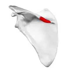 Medial view of left scapula. Deltoid tubercle shown in red.
