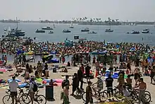 With the success of the restrictions put in place to prevent 2009's Floatopia 2, government officials made the temporary beach alcohol ban permanent in November 2009.[13] Officials also contemplated restricting beach access, an idea later made official, to retard the growth of an impending Floatopia 2010.[7][14][15] In response to the changes, attendees took to Del Playa Drive in block party fashion and renamed the event "Deltopia" after the street's name.[16][17] The event drew a smaller crowd in 2010, estimated at 8,000 attendees.[18] As officials placed restrictions on the event, attendees changed their plans and continued to grow the event with an estimated 8,000 to 10,000 attendees in 2012 and 15,000 to 18,000 in 2013.[19][20]