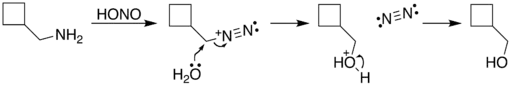 The reaction process begins with diazotization of the amine by nitrous acid. The diazonium group is a good leaving group, forming nitrogen gas when displaced from the organic structure. This displacement can occur via a rearrangement (path A), in which one of the sigma bonds adjacent to the diazo group migrates. This migration results in an expansion of the ring. The resulting carbocation is then attacked by a molecule of water. Alternately, the diazo group can be displaced directly by a molecule of water in an SN2 reaction (path B). Both routes lead to formation of an alcohol.