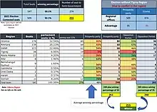 On 21 June 2021, parliamentary and regional elections were held under the country's unrest as well as the condition of COVID-19 pandemic.[35][36] Observers such as the African Union, the Eastern Africa Standby Force and necessarily the local Ethiopian civil societies did not informed the cases. The election were held in 436 parliamentary constituencies out of 547 with those 111 constituencies expected to held on 6 September including Benishangul-Gumuz, some parts of Western Oromia, Somali and Harari Region, and several zones in the Southern Nations, Nationalities, and People's Region due to irregularities and affected by fault in ballot paper.[37][38][39][40] The election was deemed a democratic improvement since past elections while NEBE faced considerable logistical challenges.[41][42] The Property Party landslide won 410 seats out of 436 in the federal parliament, exceeding his term into five years.[43][44][45][46]