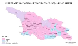 The demographic situation in Georgia, like that of some other former Soviet republics (especially Estonia and Latvia), has been characterized by two prominent features since independence: decline in total population and significant "Georgianization" of the ethnic composition. The proportion of ethnic Georgians increased by full 10 percentage points between 1989 and 2002, rising from 73.7% to 83.7% of the population.[14] This occurred due to two migratory movements: Georgians living and working in other Soviet republics returned to their homeland, while other nationalities left Georgia.[15]