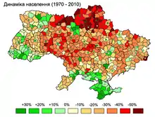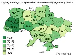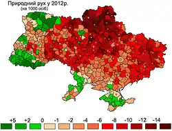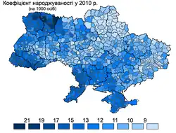 In 2007, the country's rate of population decline was the fourth highest in the world.[21] During the years 2008 to 2010, more than 1.5 million children were born in Ukraine, compared to fewer than 1.2 million during 1999–2001. In 2008 Ukraine posted record-breaking birth rates since its 1991 independence. Infant mortality rates have also dropped from 10.4 deaths to 8.3 per 1,000 children under one year of age. This is lower than in 153 countries of the world.[22]