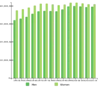 The contemporary demographics of Germany used to also be measured by a series of full censuses mandated by the state, with the most recent held in 1987. Since reunification, German authorities rely on a micro census. Demographic statistics according to the World Population Review.[28] Due to the privacy concerns of the German population after reunification, Germany did not hold a regular census until the EU-mandated 2011 German Census. The requirement was met with large disapproval. As required by the EU, Germany now continues to hold censuses every 10 years.[29]