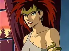 Demona (lit. '"She-Demon"'), voiced by Marina Sirtis, is a fictional character and one of the primary antagonists of the Disney animated television series Gargoyles.[1][2][3] Demona was once Goliath's mate and was part of their 10th century AD castle's Wyvern Clan. She is consumed by a hatred of humanity[4] and has attempted several times to destroy it.