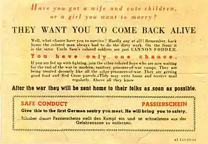 Examples from World War I included German forces providing revolutionary literature to Russian prisoners of war that were expected to return through exchange or release, French use of propaganda leaflets to demonstrate how unaffected by war the Kaiser and his family were, technical encouragement and amplification of national dissent, Wilsonian propaganda stressing peaceful settlement terms, British planting of stories attesting to underground German resistance movements and their subsequent oppression by the German government, propaganda deflecting war guilt, propaganda exposing or exaggerating the desired postwar peace terms, and the promotion of the belief that infidelity was rampant among soldiers and their families back home.[2]: 169–173