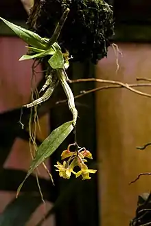 Dendrobium guerreroi, or Guerrero's dendrobium, is a member of the family Orchidaceae endemic to the Philippines.[2] It was named in honor of Mr. Guerrero, a Filipino orchid collector in the 1900s.[3] This species is a small to medium to large sized, warm growing epiphyte with thin descendant, clumping pseudobulbs that rarely branch and carry many, unsubdivided, pointed fleshy leaves. Flowers are 3 centimeters and are yellow with light orange labia.