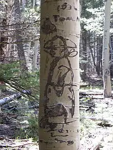 Aspen carvings are arborglyphs made in the bark of aspen trees by shepherds, many of them Basque and Irish American, throughout the Western United States. They have been documented across northern California and in areas such as Boise, Idaho and Steamboat Springs, Colorado.[11] Basque immigrants from the Pyrenees came to work as shepherds in the mid-19th century, and, spending long hours alone in forests, etched drawings and poetry into the aspen trees with a knife or even their fingernails. One expert alone has recorded around 20,000 tree carvings across California, Nevada, and Oregon, dating from the early 1900s. The markings turned darker against the pale bark as the tree healed itself. Aspens typically only live around 100 years, but arborglyphs have alsp been found on dead fallen trees. The subject of these carvings range from dates and names to quite detailed drawings, sometimes depicting explicit sexual themes. The carvings often reflect their lonely lives. Wildfires, disease, and natural deterioration are reducing the number of the aspen arborglyphs.[3]
