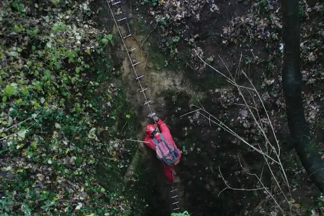 The general outline of the formation of these caves is invariably the same. The entrance is a vertical shaft some 3 feet (1 m) in diameter falling, on an average, to a depth of 60 feet (20 m). The depth is regulated by the depth of the chalk layer from the surface, although chalk can be found within a few feet, or even inches, from the surface. A depth of from 45 to 80 feet or more, is a characteristic feature.[1]