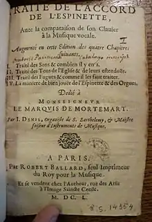 - Jean Denis II (1600 - 1672), son of Jean I. He was a practicing organist at the church of Saint-Barthélemy on Île de la Cité (now demolished) [5] as well as instrument maker and was elected as jurés of the instrument makers guild in Paris in 1647. He published in 1643 a practical treatise on harpsichord tuning, Traité de l'accord de l'espinette, which is today one of the major sources on historic tuning practice, although it touched on several subjects ranging from choir music to bad performance habits of keyboard players. Jean II is survived by one double manual instrument, currently in Musée de l'Hospice Saint Roch, Issoudun, central France.