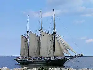 ![]() The Denis Sullivan under partial sail; her topsails, raffee, and flying jib remain unset | |