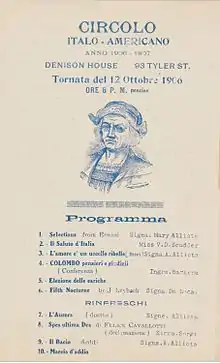 Local men and women who frequented Denison House, most of whom were immigrants, were encouraged to celebrate their heritage through cultural festivals and craft exhibitions. One such exhibition took place at the Pennsylvania Museum and School of Industrial Art in 1917. On display was "the work of Italian, Syrian, Greek and Armenian craftsmen and craftswomen, in silver, leather, linen, silk embroideries, etc., from old designs copied in part from treasure pieces in palaces, museums and private collections in Europe and America." The exhibition was reportedly a great success, with many of the items being sold.[9] The teenaged boys of the Denison House dramatic club performed Shakespearean plays to raise funds for renovations, and received encouraging reviews in the Boston Globe.[10][11]