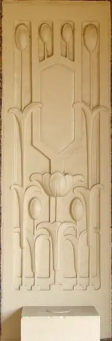 The Prairie style home was designed by Robert C. Spencer, a contemporary of Frank Lloyd Wright. He was known for blending the more modern Prairie style with historical elements, such as the half-timbering that is found on this house.[4] The tulip, which was Mrs. Hauberg's favorite flower, is featured stylistically throughout the exterior and interior of the structure. Spencer adapted the tulip to decorative elements such as stone insets, plaster molding, wood organ screens, fixtures and decorative tiles. Chicago landscape architect Jens Jensen laid out the 10-acre (4.0 ha) property to appear as a Wisconsin woodland. A winding path and stone bridge from Jensen's design remain on the west side of the house.[4]