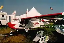 A derivative of the Avid Flyer,[3] the Kitfox was an early kit plane to feature quickly-folding wings that greatly simplify carriage and storage.[4] The appeal of the aircraft was that it could be built in a two-car garage. Then it would be towed to the airport with the wings folded. The landing gear may be easily converted to floats or skis.