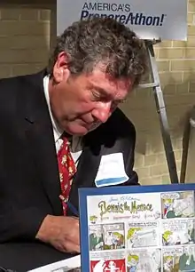 Dennis the Menace is a daily syndicated newspaper comic strip originally created, written, and illustrated by Hank Ketcham. The comic strip made its debut on March 12, 1951,[1] in 16 newspapers and was originally distributed by Post-Hall Syndicate.[2] It is now written and drawn by Ketcham's former assistants, Marcus Hamilton (weekdays, since 1995), Ron Ferdinand (Sundays, since 1981), and son Scott Ketcham (since 2010), and distributed to at least 1,000 newspapers in 48 countries and in 19 languages by King Features Syndicate.[3] The comic strip usually runs for a single panel on weekdays and a full strip on Sundays.