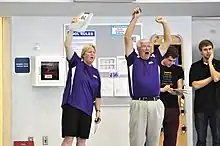 In his first year at Ferndale High School in 1967, Denny Hill won 3 meets, which he attributed to most of the senior quitting since he had been their 3rd coach and was requiring them to come to practice.[5] During his tenure as coach at Pioneer High School, the men's and women's swim teams won 31 Michigan High School State Swim Championships (15 for the men's team and 16 for the women's team).[7] After getting married in 1983, Denny and Liz Hill became a coaching team. Liz was named assistant coach of both the men's and women's teams beginning in 1984 but became co-head coach of both teams in 2005. Between 1969 and 2014, the Pioneer Men's Swim & Dive Team won the Michigan High School State Championship in the following years: 1977, 1978, 1979, 1980, 1981, 1982, 1984, 1985, 1993, 1999, 2002, 2003, 2005, 2006, and 2009. In only 6 of those 45 years did the men's team place lower than 4th place in the state championships. Between 1973 and 2010, the Pioneer Women's Swim and Dive Team won the Michigan High School State Championship in the following years: 1979, 1985, 1987, 1989, 1990, 1991, 1992, 2000, 2001, 2002, 2003, 2004, 2005, 2006, 2007, and 2008. During these time periods, the men's and women's teams won 9 National Dual Meet (Power Points) Championships (the women's team also won 3 Mythical National Championships from Swimming World). Over the course of Denny's career at Pioneer High School, the combined dual meet record was 1011-128-2 (567-90 for the men and 444-38-2 for the women.[1] The swim program produced 245 National Interscholastic Swim Coaches Association (NISCA) All-American Swimmers (140 men and 105 women) for a total of 862 All-American awards. These swimmers included Olympians Kara Lynn Joyce and Alison Gregorka. At Pioneer High School, Joyce set 4 national high school records in the 50 yard freestyle, 100 yard freestyle, 200 yard freestyle relay, and 400 yard freestyle relay before going on to swim at the University of Georgia.[8] Joyce has 4 Olympic silver metals.[9] Gregorka played water polo for Stanford University,[10] and was a member of the US water polo team that won a silver medal at the 2008 Beijing Olympics.[11] Denny also coached Dan Stephenson, who wrote The Underwater Window, a novel about competitive swimming.[12] Denny Hill was named Michigan Interscholastic Swim Coaches Association Coach of the Year 31 times, Michigan High School Coaches Association Hall of Fame Inductee in 2003, NISCA Outstanding Service Award recipient in 2005, NHSACA National Coach of the Year in 1999, and a NHSACA Hall of Fame Inductee in 2008.[13][14] In March 2014, Denny Hill was inducted into the NISCA Hall of Fame for swim coaches.[15] In November 2008, Pioneer High School rededicate their pool, "Hill Pool."[16] Denny was particularly honored that the pool naming was inclusive of both him and Liz.[16] Both Denny and Liz Hill retired from coaching the women's team in 2010 and the men's team in 2014.[7] In 2011, Eric Stanczyk took over as head coach of the Pioneer Women's Swim and Dive Team. Stanczyk swam at Eastern Michigan University and was the captain of the team in his senior year;[17] he also swam with the Hills' son, Steven, at EMU.[18] Following the Hills' retirement from the men's team in 2014, Stefanie (Liebner) Kerska took over as head coach of the Pioneer Men's Swim and Dive Team.[19] Kerska swam for the Hills at Pioneer High School, and then went on to be a 7-time Big Ten Champion and assistant coach at the University of Michigan.[20][21] While at the University of Michigan, Kerska was the first woman to be selected by CollegeSwimming.com as Assistant Coach-of-the-Year.[22] Kerska took over as head coach of the Pioneer High School Women's Swim and Dive Team in the fall of 2015.