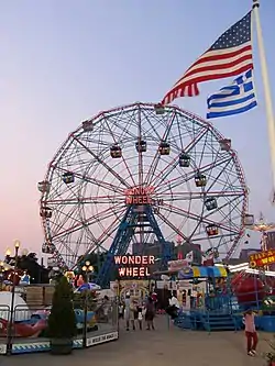 Deno's Wonder Wheel Amusement Park is a family-owned amusement park located at Coney Island, Brooklyn, New York City. It features six adult rides and 16 kiddie rides, including a dozen family rides that parents and children can ride together. The park is named for its main attraction, the Wonder Wheel, a 150-foot (46 m) eccentric wheel built in 1920.[2]