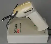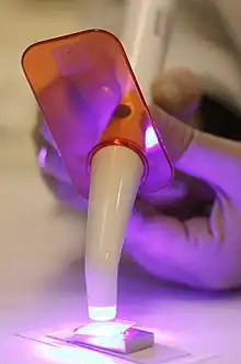 A dental curing light is a piece of dental equipment that is used for polymerization of light-cure resin-based composites.[1] It can be used on several different dental materials that are curable by light. The light used falls under the visible blue light spectrum. This light is delivered over a range of wavelengths and varies for each type of device. There are four basic types of dental curing light sources: tungsten halogen, light-emitting diodes (LED), plasma arcs, and lasers. The two most common are halogen and LEDs.