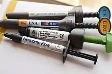[24] Another combination of composite resin and glass ionomer technology, with focus lying towards the composite resin end of the spectrum. Compomers are essentially made up of filler, dimethacrylate monomer, difunctional resin, photo-activator and initiator, and hydrophilic monomers. The primary reason of the addition of filler is to decrease the proportion of resin and increase the mechanical strength besides improving the material's appearance.