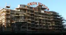 Denver Union Station is the main railway station and central transportation hub in Denver, Colorado. It is located at 17th and Wynkoop Streets in the present-day LoDo district and includes the historic station house, a modern open-air train shed, a 22-gate underground bus station, and light rail station.[5][6] A station was first opened on the site on June 1, 1881, but burned down in 1894. The current structure was erected in two stages, with an enlarged central portion completed in 1914.