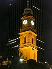 The basement has three entrances: the main entrance in Bridge Street, and two others in Gresham Street (one originally used for carriage). The façades are of dressed Pyrmont sandstone with cornices and balusters at each floor level, with a dome and tower tops made from copper.[1] The four façades are all richly decorated with classical motifs and statuettes and are dissimilar to each other. Barnet's mix of the orders and their integration into the building is significant. For example, the lowest level of the building is adorned with Doric and Ionic pilasters, whereas Corinthian and Ionic ones are used above. The clock tower has an 'onion' copper dome which was influenced by Sir Henry Parkes’s water carafe.[7]