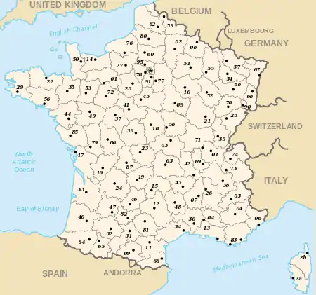 ![]() Regions and departments of metropolitan France; the numbers are those of the first column (except for Corsica, which shows the division of the island until 2018, and the division of the Metropolis of Lyon from Rhône is not shown). ![]() The departments in the immediate vicinity of Paris; the numbers are those of the first column |