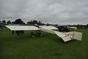 In later examples, such as that in the Shuttleworth Collection, the horizontal tail surface was shorter, the leading edges being swept at about 45°. A distinctive feature of the type was that the trailing edge of the rudder and elevator was braced by wires leading to the control horns. The controls consisted of a wheel mounted on an inverted U-shaped yoke, the uprights of which were outside the fuselage structure. Fore and aft movement of the entire yoke operated the elevator and the wheel operated the wing warping. The rudder was controlled by pedals. The undercarriage consisted of a pair of trapezoidal frames, each braced by a diagonal member extended forwards to form a short upcurved skid to protect the propeller in the case of nose-overs, with a pair of wheels carried on a sprung cross axle between the two frames.[4]