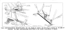 The wings were mounted below the upper longerons and were slightly tapered. Lateral control was by wing warping. In earlier aircraft the warping and bracing wires were attached to a pair of vertical kingposts just aft of the leading edge of the wing: in later aircraft these were braced by diagonal struts leading back to the fuselage longerons. The empennage of early examples consisted of an elongated triangular vertical fin with a cutout to allow elevator travel with a rectangular rudder hinged to the trailing edge, and a similarly elongated triangular tailplane with an elevator.[3]