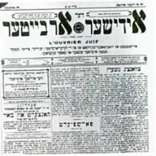 Der yidisher arbeyter (דער אידישער ארבייטער: 'The Jewish Worker') was a Yiddish-language labour movement journal published from Paris, France. It was the first full-fledged Jewish labour periodical in the country, and catered to the Jewish branches of the Confédération générale du travail (CGT).[1] It was the monthly organ of the Intersektionen Byuro ('Inter-sectional Bureau'), the coordination of Jewish trade union branches of the CGT.[2] The first issue appeared on October 9, 1911.[2][3] Der yidisher arbeyter represented a crossroads between the French labour movement and the Central and European Jewish culture.[2]