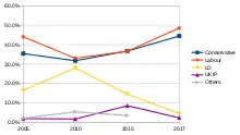 A seat contested relatively closely between the two largest parties since 1950, Derby North was held consecutively by the Labour Party's Clifford Wilcock, Niall MacDermot, and Phillip Whitehead.[n 3] At the 1979 general election, it was covered by the BBC as the bellwether seat as the 41st of 41 seats that the Conservative Party needed to win; that year it stayed under control of Labour, but the Conservatives won the election regardless. Its exit poll was a central point of discussion of the BBC's election night coverage.[5]