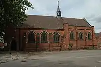 As the school developed further with more pupils, as a result of the building of the Pearson Building, space became a premium. An appeal was made for the erection of a school chapel and thus allowing 'Big School' to be made available solely for educational purposes. In June 1882 a new little iron chapel, often referred to as a "tin tabernacle" was erected adjoining King Street for the cost of £290, which included a sum of £150 being contributed in thank-offerings of £5 each by gentlemen educated at Derby School who had gained scholarships, exhibitions or similar honourable distinctions.[17]