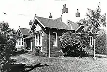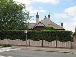 Derrylyn is a large single storey federation cottage of two-tone bricks with a fine slate and terracotta roof punctuated by numerous tall roughcast chimneys.[1]